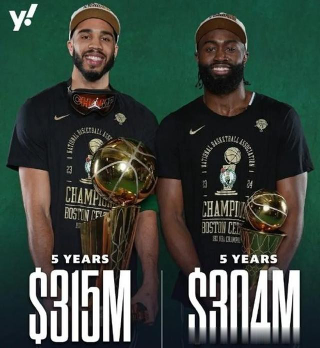 在现有的NBA薪资规则之下,一支球队夺冠之后,要想连冠,几乎难如登天,根本问题就出在球队薪资空间被锁死,面临巨额的奢侈税,球队无力承担,最典型的就是凯尔特人,球队在夺冠之后给塔图姆,杰伦布朗奉上顶薪,两人的薪水加起来,高达1.2亿美元左右。