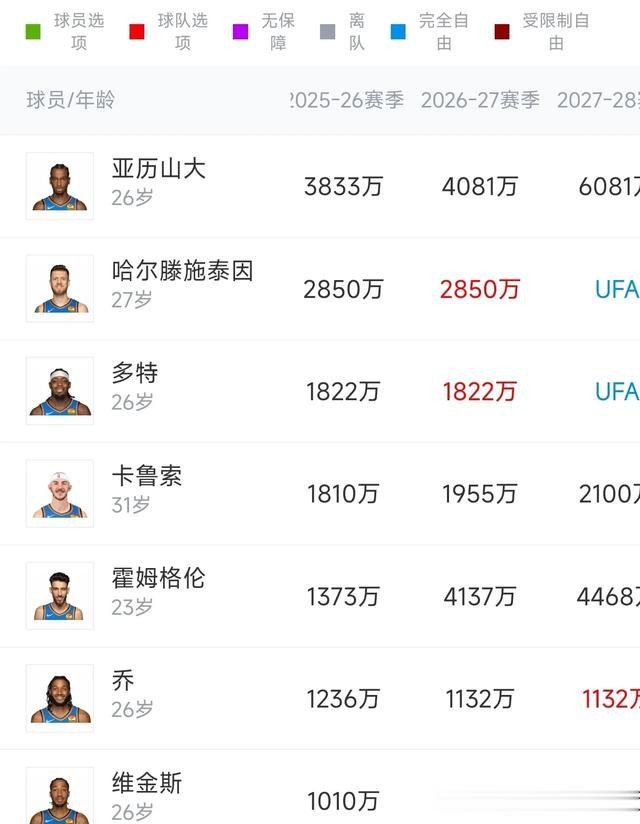 1、25-26赛季,亚历山大师3833万美元,霍姆格伦是1373万美元,这两人的薪水,与上个赛季相比,基本上不会变,除了杰伦威,现在情况还不确定之外,其他人的薪水,基本上都不会变,所以说,整体上,雷霆明年没有任何的压力。