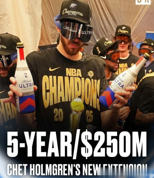 接下来看看切特霍姆格伦的合同,他今天与雷霆签下的是一份5年2.5亿美元的合同,平均每年5000万左右,但这份合同,是从26-27赛季才开始!